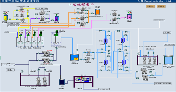 该项目为天津三星电子SDI废水处理工程系统,我公司在本项目中主要负责水厂整个系统自控的设计和施工,在系统设计中PLC选用ABB公司AC31系列,上位组态软件采用北京杰控的FAMEVIEW6.0,实现了对整个系统所用电气设备及仪表的控制与监视,为处理系统安全可靠运行提供技术保障。