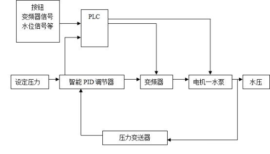 变频调速恒压供水系统由变频器、泵组电机、供水管网、储水箱、(智能PID调节器)、压力变送器、PLC控制单元等部分组成,控制系统原理图如图所示。其中变频器的作用是为电机提供可变频率的电源,实现电机的无级调速,从而使管网水压连续变化,同时变频器还可作为电机软启动装置,限制电机的启动电流。压力变送器的作用是检测管网水压。智能PID调节器实现管网水压的PLC调节。PLC控制单元则是泵组管理的执行设备,同时还是变频器的驱动控制,根据用水量的实际变化,自动调整其它工频泵的运行台数。变频器和PLC的应用为水泵转速的平滑性连续调节提供了方便。水泵电机实现变频软启动, 消除了对电网、电气设备和机械设备的冲击,延长机电设备的使用寿命。