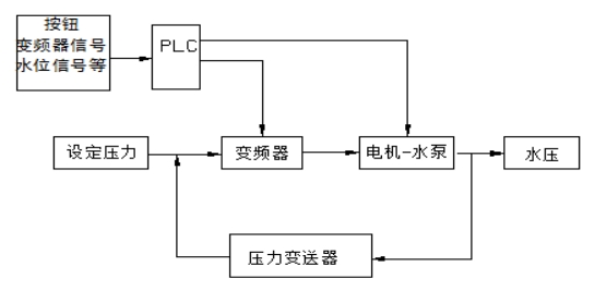 变频调速恒压供水系统由变频器、泵组电机、供水管网、储水箱、(智能PID调节器)、压力变送器、PLC控制单元等部分组成,控制系统原理图如图所示。其中变频器的作用是为电机提供可变频率的电源,实现电机的无级调速,从而使管网水压连续变化,同时变频器还可作为电机软启动装置,限制电机的启动电流。压力变送器的作用是检测管网水压。智能PID调节器实现管网水压的PLC调节。PLC控制单元则是泵组管理的执行设备,同时还是变频器的驱动控制,根据用水量的实际变化,自动调整其它工频泵的运行台数。变频器和PLC的应用为水泵转速的平滑性连续调节提供了方便。水泵电机实现变频软启动, 消除了对电网、电气设备和机械设备的冲击,延长机电设备的使用寿命。